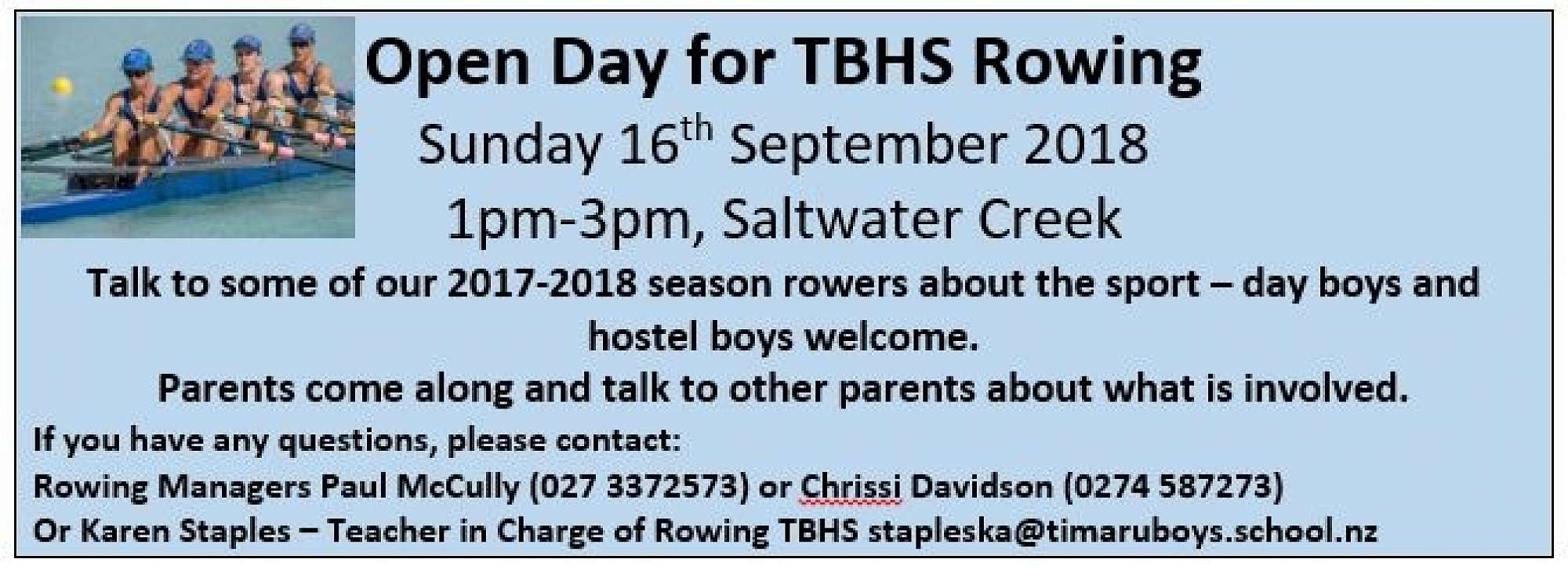Rowing Managers Paul McCully (027 3372573) or Chrissi Davidson (0274 587273)