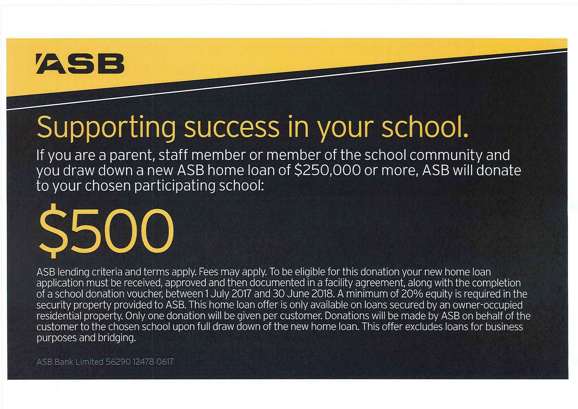 If you are a parent, staff member or member of the school community, and you draw down a new ASB home loan of $250,000 or more, ASB will donate $500 to your chosen participating school.