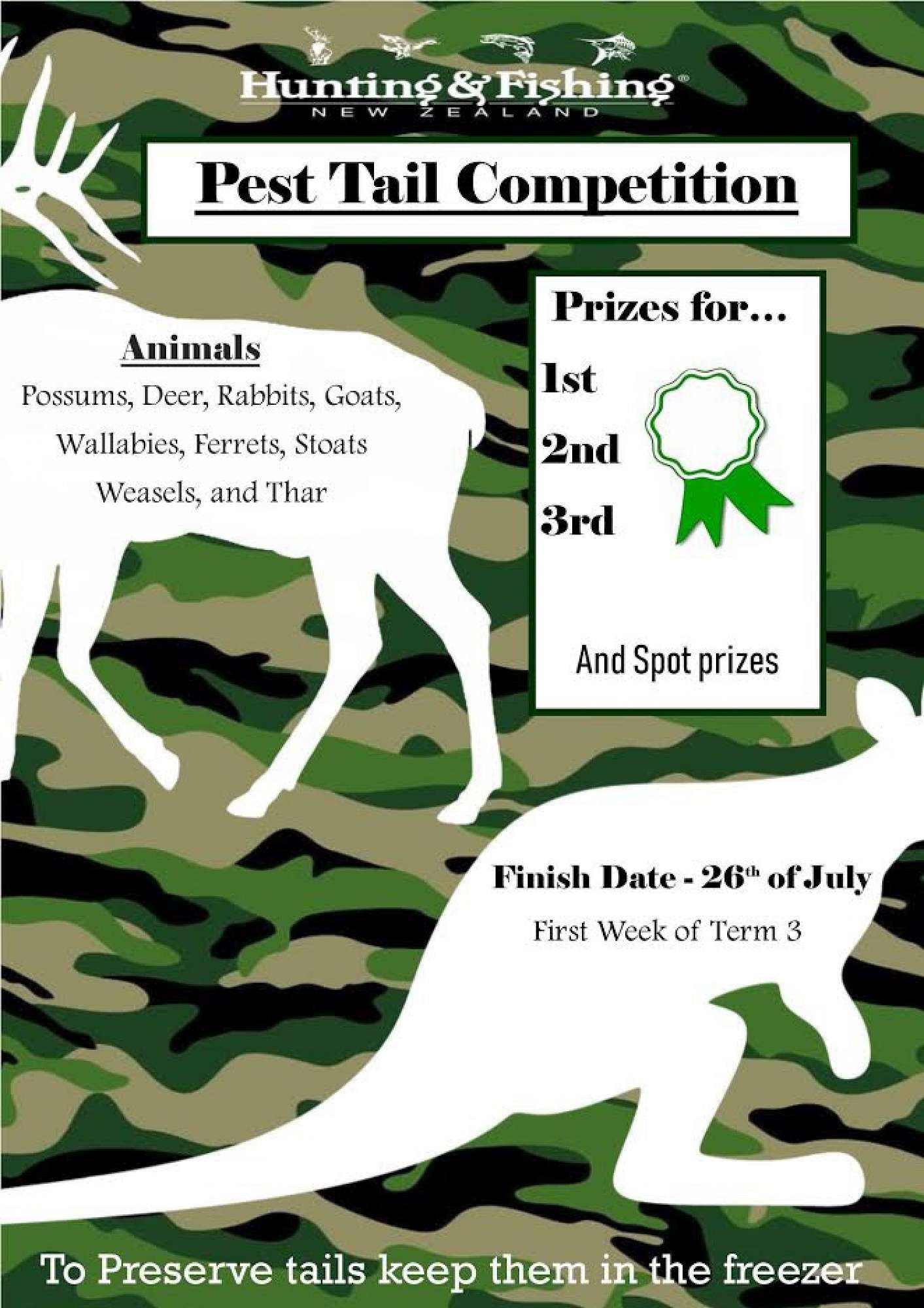 We're encouraging students to bring in the tails of pests they have eradicated before the end date. Tails will be accepted frozen or fresh (so we don't get rotten tails after being left for a month). Pests accepted are deer, tahr, stoats, ferrets, weasels, possums, rabbits, wallabies and goats.