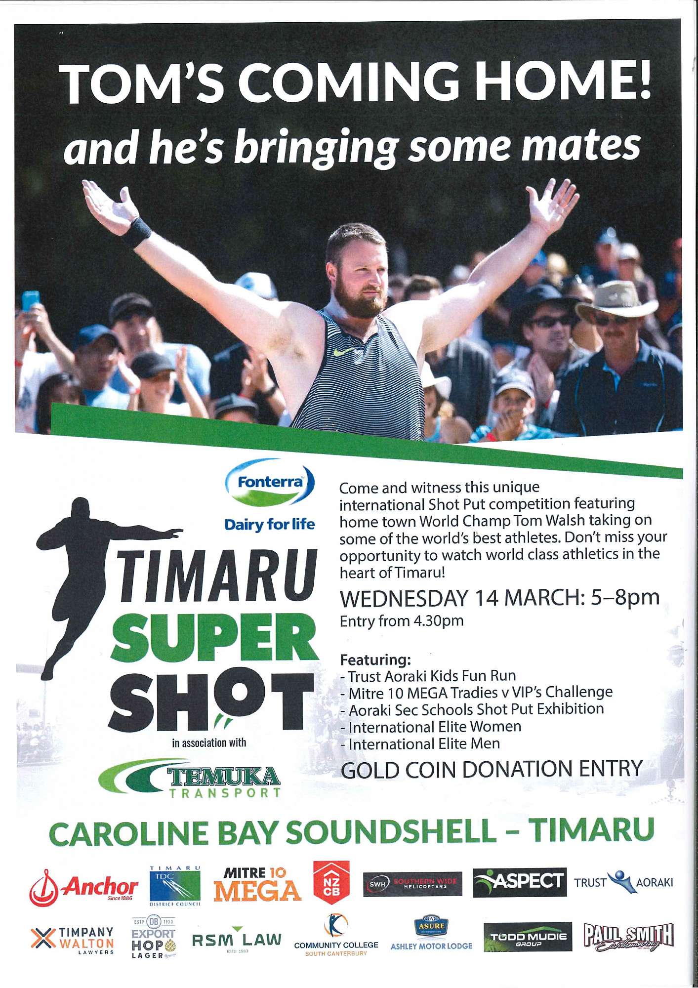 The Timaru Super Shot will bring elite shot put to the heart of Timaru, in the picturesque setting of the Caroline Bay Soundshell. A world class line-up of throwers will grace the specially constructed circle, in what promises to be one of the biggest shot put competitions in the world this year!
