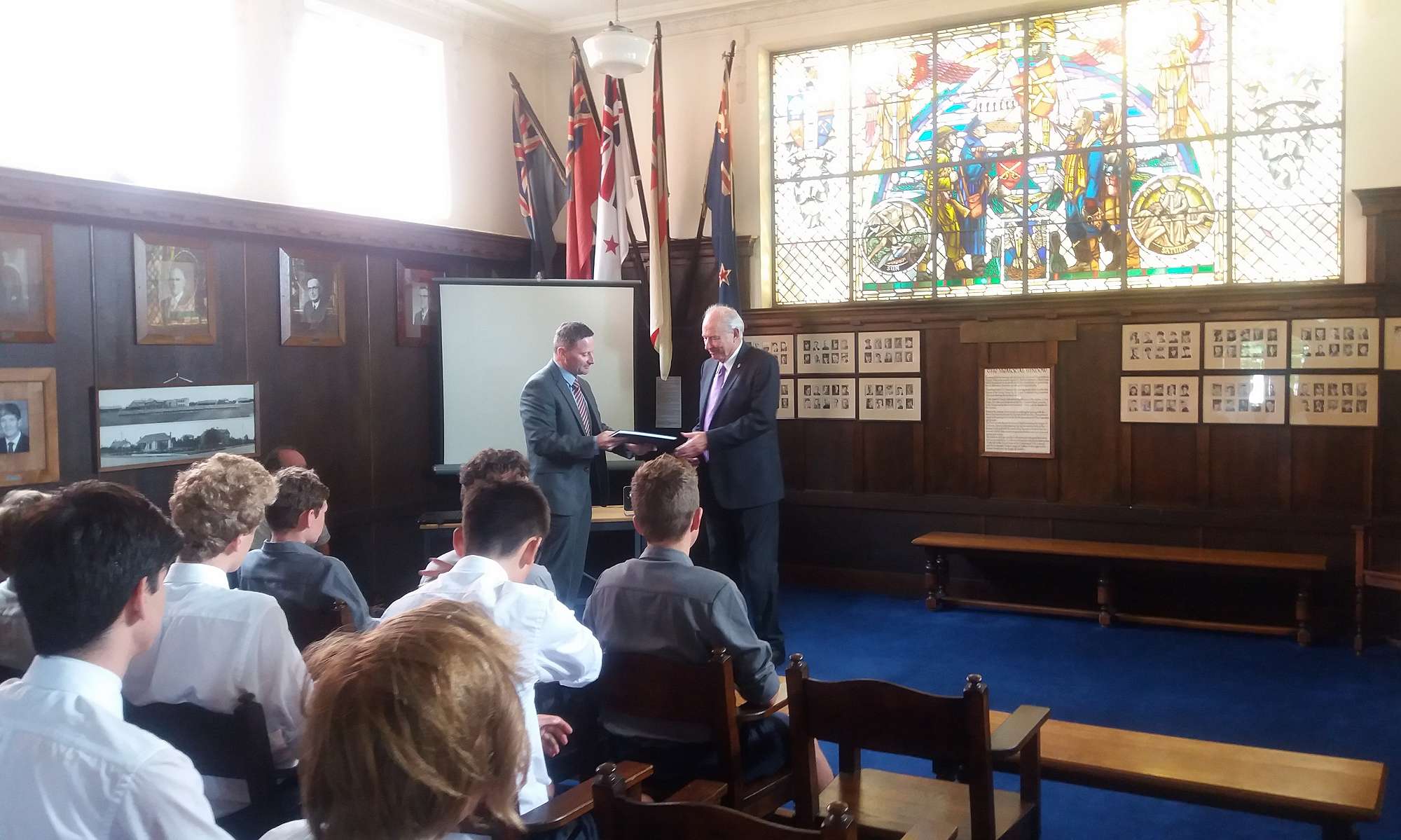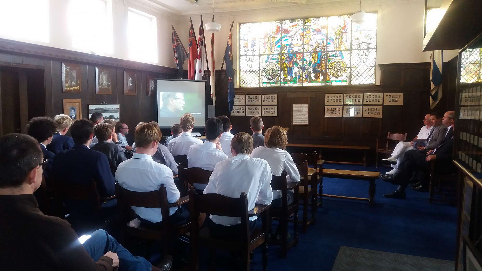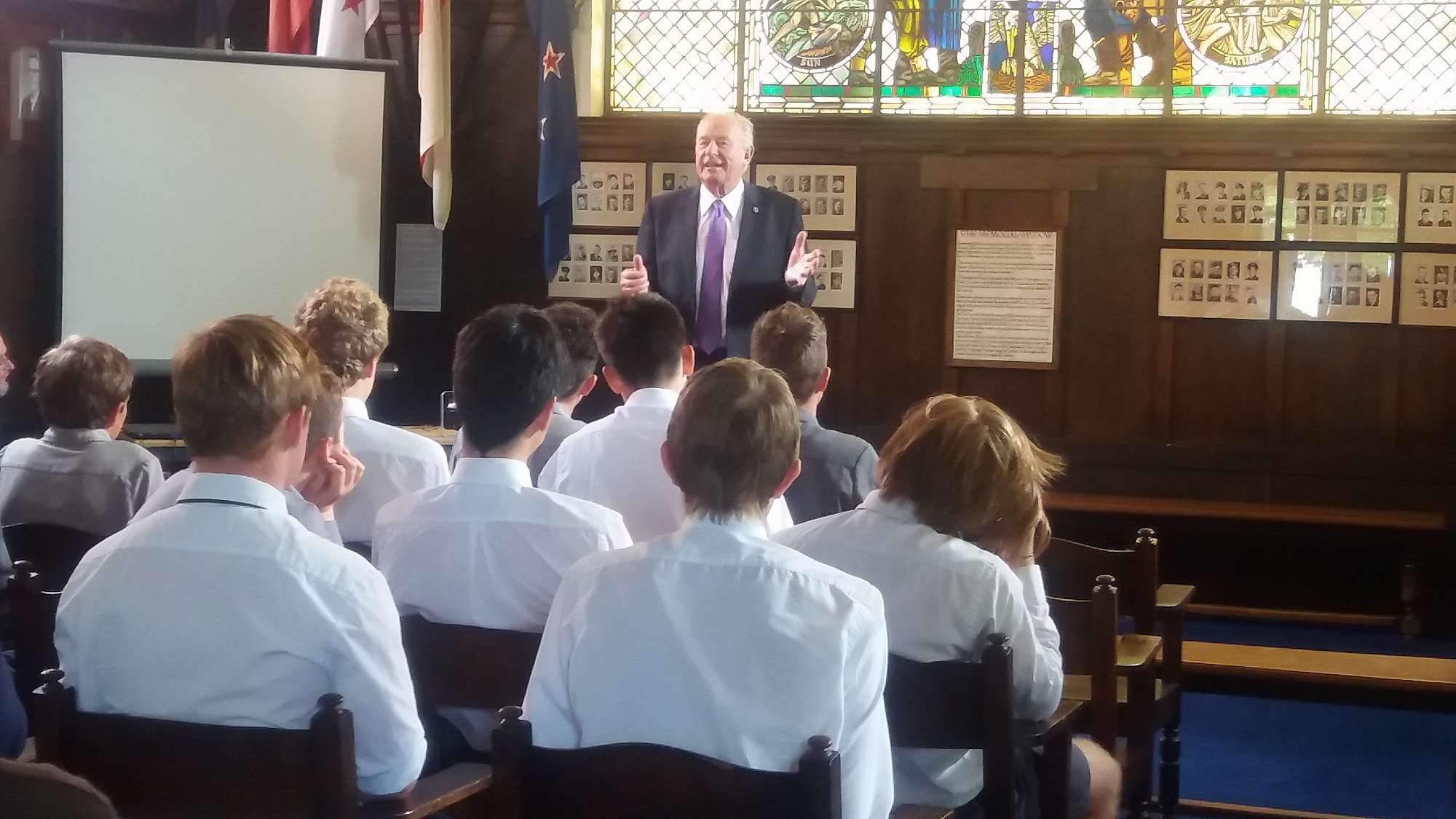 Considering the nature of this project, meeting in the Memorial Library couldn’t have been more appropriate – nor could having Sir Don speak near the 13 Old Boys found on the eastern wall, each knighted for their services to New Zealand too.