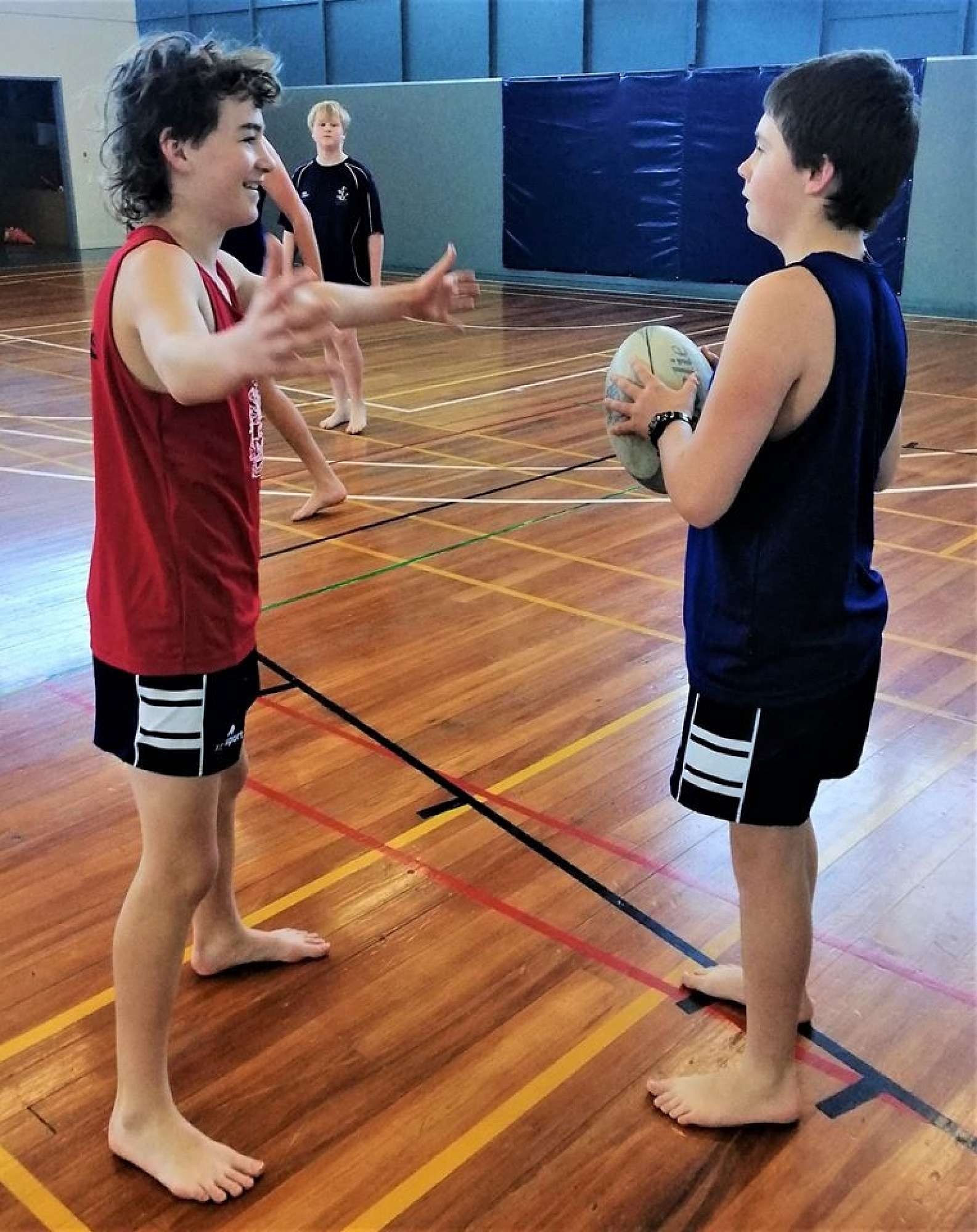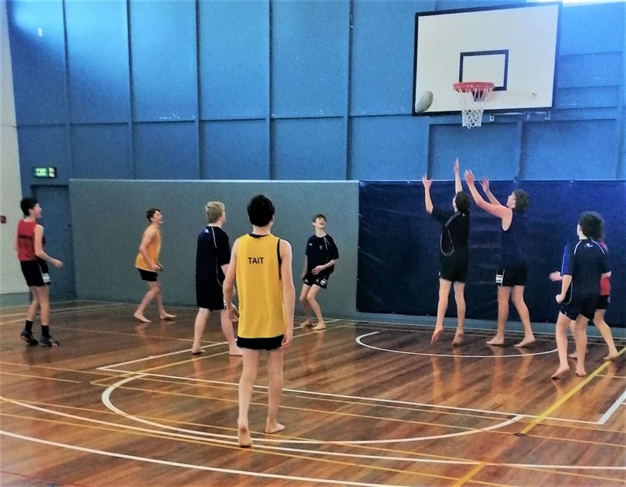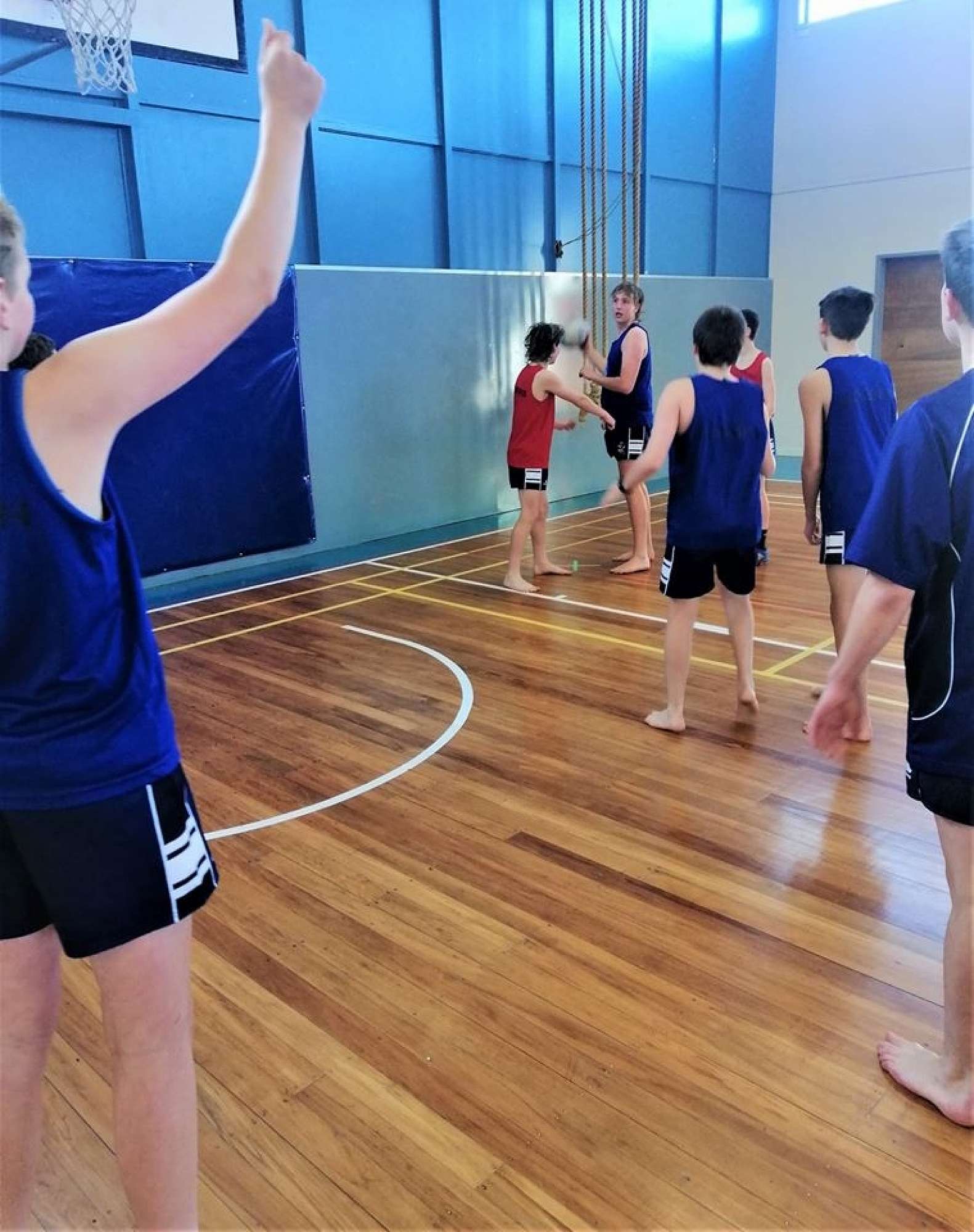 This week for the last week of Term 2, it was decided to introduce some boys to a range of adapted sports that could improve their fitness and skills. These pictures show Rimu playing an adaption of netball, using the rugby ball, where boys could all score goals, but had to use netball rules in terms of not been allowed to run with the ball and to defend without touching their opponent.