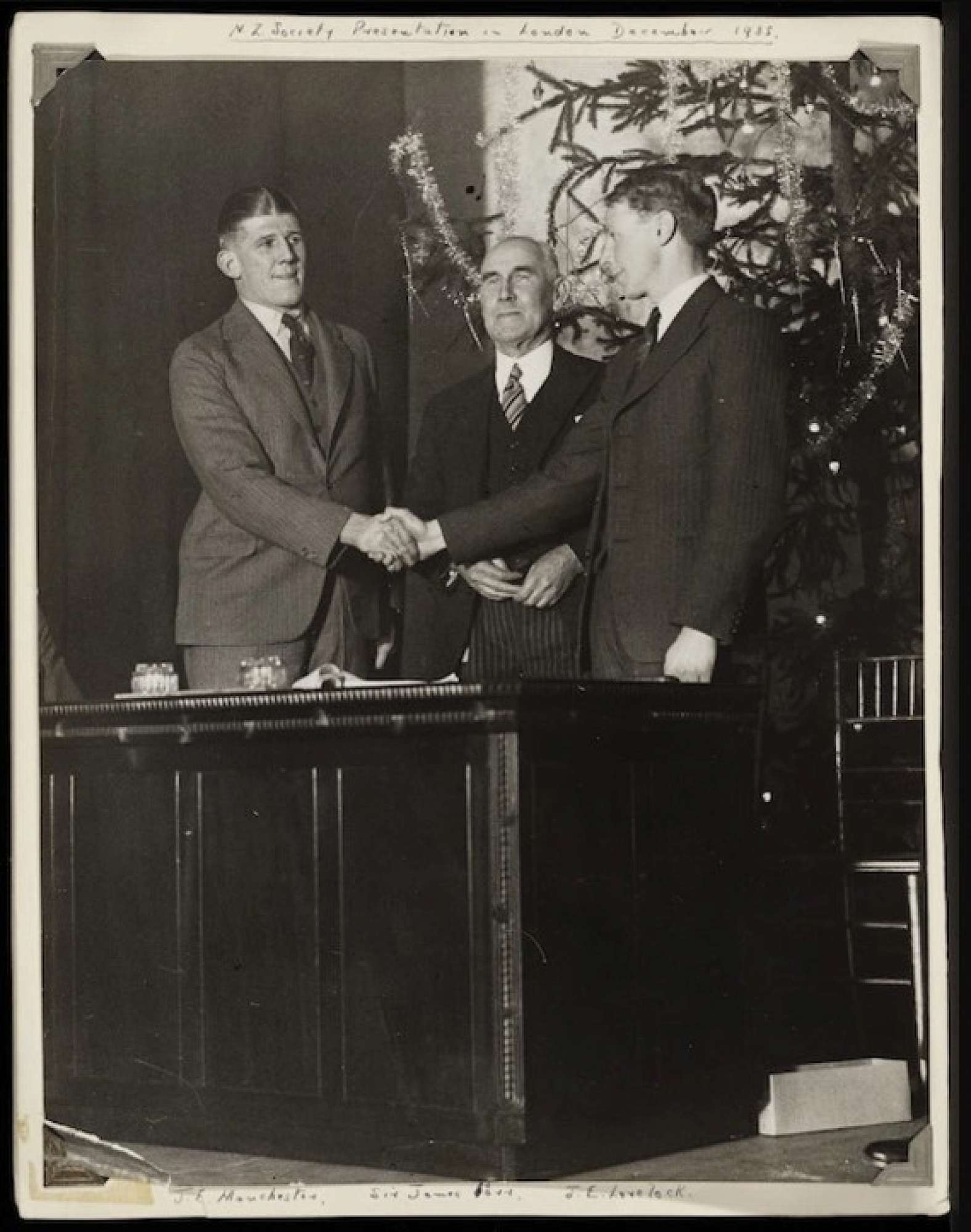 Photograph below shows Lovelock shaking hands with Jack Manchester at the New Zealand Society presentations in London. Also in the image is New Zealand High Commissioner Sir James Parr. Function was held at the Hotel Metropole.